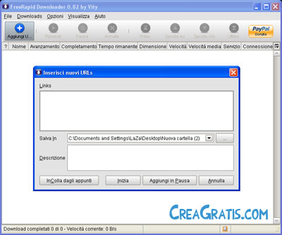 La finestra Inserisci nuovi URLs vi permetterà di incollare i link di Rapidshare, Megaupload o degli altri siti di file sharing (in alcuni casi dopo aver copiato i link da qualche sito vedrete comparirli automaticamente nella finestra di FreeRapid Downloader). FreeRapid Downloader gestisce il download di tantissimi siti di file sharing. A questo link potrete trovare la lista completa. Subito dopo l’inserimento dei link scegliete il percorso dove volete vengano salvati i file e cliccate sul tasto Inizia.
